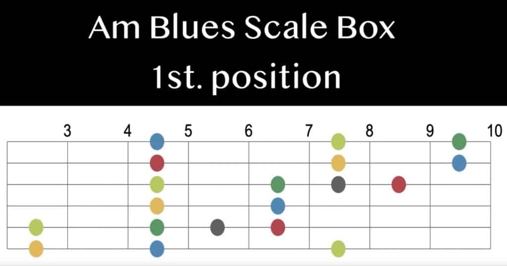 今回の例では Amペンタトニックにブルーノートを足した第一ポジションを拡張したものを使用。