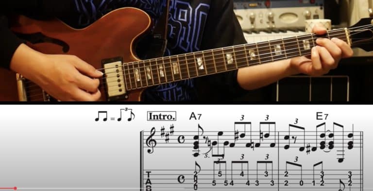 12小節のコード進行をまず覚え、それに合わせてギターでシャッフルのリズムを刻む練習をしてみてください。