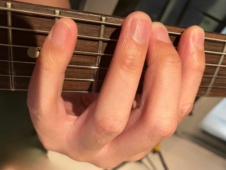 左手が力まないように、「フレット(金属部分)になるべく近い位置」を押さえることを意識してください。 フレットの際を的確に捉えることができれば、指の力をほとんど使わずにクリアな音が出ます。