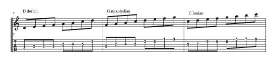 - コードスケール:Dm7→G7→CMaj7とコード進行がある上で、Dm7にDドリアンを当てる(コードごとにスケールを選ぶ)