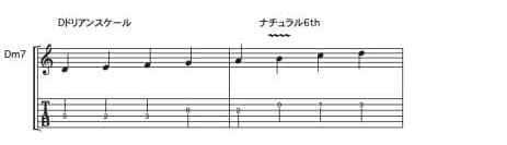 Dm7のコード上でDドリアンスケールの響きを得たいのであれば、 特徴音であるナチュラル6th(B)を弾く